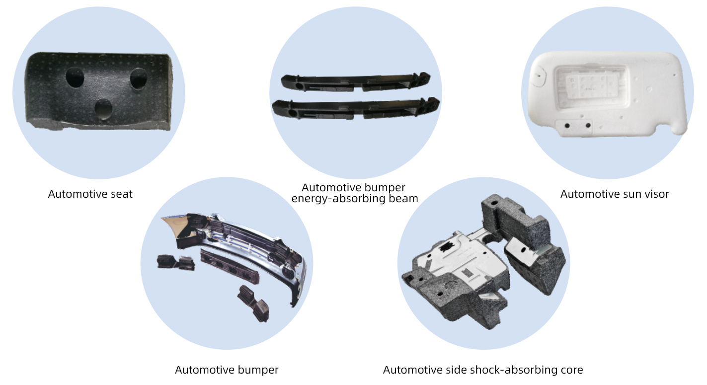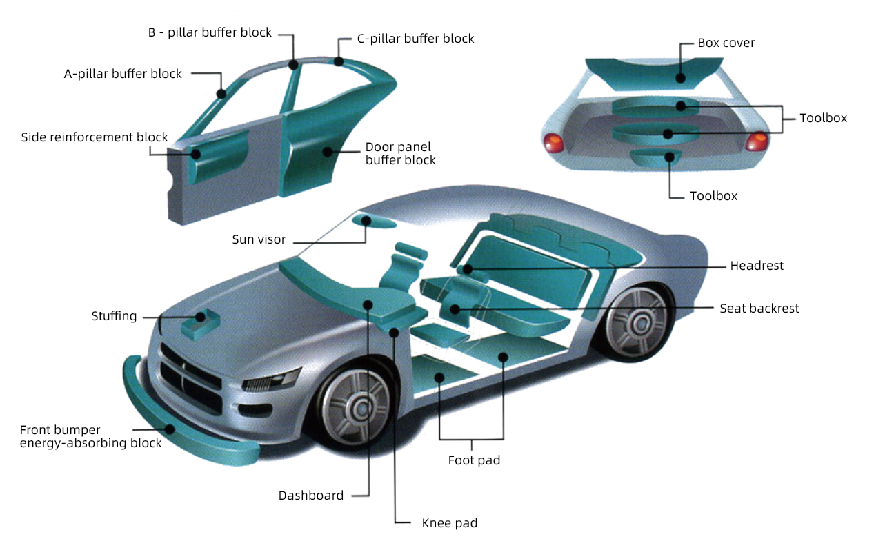 bumper absorbers, side protectors, door impact absorbers, cushioning pads, headrests, sun visors, and tool storage boxes.